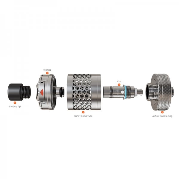 Le clearomiseur est livré avec deux drip tips : un court pour une vape MTL plus serrée, et un long pour un tirage plus frais. Leur format 510 permet également de les remplacer par tout drip tip du même standard.